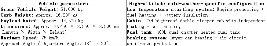 Tipo de veículo: Caminhão basculante de engenharia, versão especial para regiões de alta altitude e frias, adequado para cenários pesados, como mineração e construção de infraestrutura