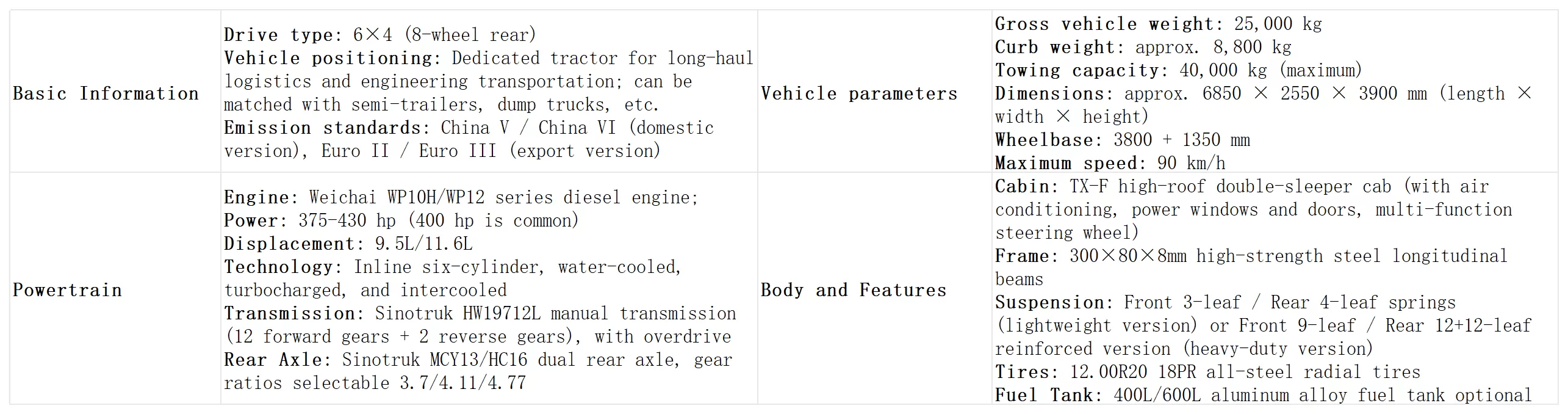 Os parâmetros principais deste caminhão trator Sinotruk Howo TX 6 × 4 (versão com chassi) são os seguintes: